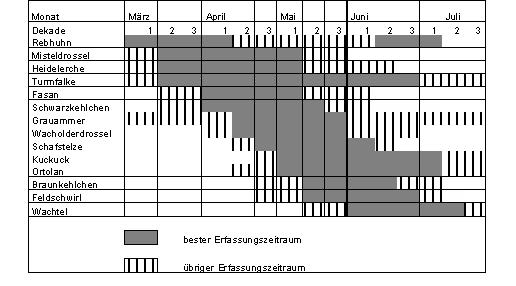 Liebe Freunde und Mitarbeiter, in diesem Jahr steht gemäß Beschluss der ![]() ![]() ![]() kulturen. Daneben sollen auch „mittelhäufige“ Arten möglichst flächendeckend erfasst werden, um aktuelle Daten für die ![]() Folgende Arbeitsschwerpunkte haben wir uns für 2007 vorgenommen: Im Rahmen der Kartierungen für unsere geplante Avifauna und das ADEBAR-Projekt (Atlas deutscher Brutvogelarten) wollen wir bis spätestens 2008 weitere Kenntnislücken schließen: ![]() ![]() ![]() ![]() ![]() Bestandsaufnahme von Brutvögeln der Offenlandschaft Als „Offenlandschaft“ werden alle nicht bewaldeten und nicht bebauten Flächen bezeichnet, also im Wesentlichen landwirtschaftlich genutzte Gebiete mit den dazugehörigen Strukturen wie Hecken, Feldgehölze, Wegränder usw. Dieser Landschaftstyp ist mit rd. 700 km ² der im Kreisgebiet am weitesten verbreitete. Die Vogelwelt landwirtschaftlich genutzter Flächen hat in den letzten Jahrzehnten die stärksten Veränderungen hinnehmen müssen, wie das Beispiel „Wiesenvögel“ deutlich macht. Aber auch die Vögel der Ackerlandschaft sind von neuen Entwicklungen, wie zunehmendem Maisanbau, betroffen. Aktuelle Daten zu Brutvogelvorkommen in verschiedenen Ackerkulturen sind in dieser Diskussion dringend erforderlich. Für die diesjährige Kartierung sind zwei Schwerpunkte geplant: I. Kreisweite Kartierung ausgewählter Arten: Ortolan: Letzte kreisweite Kartierung 1996 (PLINZ), inkl. Nachkartierungen bis 2000 882 Reviere. Zwischenzeitlich Bestandsaufnahmen in mehreren EU-Vogelschutzgebieten, in einigen Gebieten augenscheinlich Zunahme. Braunkehlchen: Letzte kreisweite Kartierung 1995 (PLINZ). Damals noch 790 Reviere, gegenüber 1985 (1032 Reviere) deutlicher Rückgang. Seither scheint der Bestand in den meisten Gebieten weiter rückläufig zu sein. Grauammer: Letzte kreisweite Kartierung 1996 mit 35 Revieren (PLINZ 2002), 2004 dagegen in der Landgrabenniederung rd. 50 Reviere (KELM). Seither leichte Zunahmetendenz, besonders auch im Elbetal. Zusätzlich sollten noch folgende Arten mit kartiert werden: Turmfalke, Fasan, Rebhuhn, Wachtel, Kuckuck, Schwarzkehlchen, Mistel- und Wacholderdrossel, Feldschwirl, in Teilbereichen auch Schafstelze und Heidelerche. Die kreisweite Kartierung kann mit dem Rebhuhn Anfang März bei gutem Wetter (windstille, milde Abende) beginnen und Mitte Juli mit der Wachtel enden. Die wichtigste Phase liegt zwischen Ende April und Ende Juni mit den Aktivitätsschwerpunkten bei Ortolan, Braunkehlchen und Grauammer. Hinweise zur Methode: Für die kreisweite Kartierung von Ortolan, Grauammer und Braunkehlchen sollten die in Frage kommenden Lebensräume möglichst dreimal kontrolliert werden. Die anderen aufgeführten Arten sollten als „Beifang“ mit kartiert werden, lediglich für die Rebhuhnerfassung sind gesonderte Kontrollen notwendig. Beobachtungen (siehe Abkürzungen in Klammern) der verschiedenen Durchgänge sollten mit unterschiedlichen Farben in die Karte (1:25.000) eingetragen werden. Bei Brutnachweisen bitte das Artkürzel einkreisen: (Bk), für Brutverdacht (z.B. warnende Altvögel) unterstreichen: Bk. Hilfreich bei der Kartierung des Ortolans ist der Einsatz einer Klangattrappe. Braunkehlchen (Bk): Kartierung singender Männchen, einzelner und verpaarter Vögel, insbesondere warnender und fütternder Altvögel. Da sich Durchzug und Brutbeginn bis Mitte / Ende Mai überschneiden, sollte versucht werden, frühere Beobachtungen durch Nachweise ab Ende Mai zu bestätigen. Bitte unbedingt Angaben zum Verhalten und zum Lebensraum machen und auf fütternde Altvögel achten. Wenn möglich, Bruterfolg notieren (flügge Junge). Ortolan (O): Kartierung singender Männchen ab Ende April, ab Anfang Juni auch warnender und fütternder Altvögel. Günstigste Kartierzeit ab Sonnenaufgang bis 5 Stunden danach. Lebensräume: Von Bäumen, Feldgehölzen untergliederte Ackerlandschaften bzw. Waldränder. Grauammer (Ga): Kartierung singender Männchen ab Mitte April, ab Mitte Mai auch warnender und fütternder Altvögel. Im Kreisgebiet vor allem auf den Geestinseln Öring und Lemgow und in der Lüchower Landgrabenniederung sowie bei Harpe, neuerdings aber auch an mehreren Stellen im Elbetal und auf dem Höhbeck. Turmfalke (Tf): Alle Beobachtungen von Mitte März bis Ende Juni kartieren. Rebhuhn (Re): Kartierung rufender Männchen von Anfang März bis Anfang April in der Abenddämmerung von Sonnenuntergang bis Dunkelheit zu Fuß oder mit dem Fahrrad entlang der Feldwege. Zusätzlich auch danach alle Sichtbeobachtungen von Einzelvögeln, Paaren und Familien notieren. Wachtel (Wa): Kartierung rufender Männchen ab Ende Mai bis Mitte Juli, günstigste Zeit in der Morgen- und Abenddämmerung. Möglichst Feldfrucht des Rufortes notieren. Fasan (Fa): Alle Beobachtungen kartieren, insbesondere rufende Hähne. Kuckuck (Ku): Ab Anfang Mai bis Ende Juni Kartierung rufender Männchen bzw. lockender Weibchen. Beste Tageszeit: vor Sonnenaufgang. Wegen großer Streifgebiete der Männchen benachbarte Reviere nur bei gleichzeitiger Feststellung kartieren. Heidelerche (He): Kartierung vor allem in bislang wenig erfassten Bereichen. Ankunft Mitte März, Gesang bis Anfang Juni. Wiesenschafstelze (St): Erfassung singender Männchen, Vögel auf Sitzwarten und fütternder Altvögel von Ende April bis Anfang Juni. Kolonieartiges Brüten möglich, weite Nahrungsflüge. Zugtrupps können bis Ende Mai auftreten. Misteldrossel (Md): Brutvogel strukturreicher, von Feldgehölzen und Wäldern durchsetzter Landschaft sowie in Nadelwäldern. Kartierung singender Männchen, auch Nahrung suchender Paare, später auch warnender Altvögel (brütet sehr früh) bis Mitte Mai. Wacholderdrossel (Wd): Brutvogel vor allem in den Flussniederungen und im niederen Drawehn, gern in Pappelbeständen oder Baumreihen. Kartierung singender und warnender Vögel ab Mitte April. Schwarzkehlchen (Sk): Alle Feststellungen kartieren, dabei sind Angaben zum Verhalten wichtig (Gesang, warne
